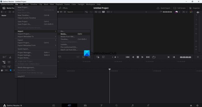 Para importar videos al Media Pool y editarlos, haga clic enArchivoen la barra de menú y coloque el cursor sobreImportary seleccioneMedios de comunicación. O puedes usar el atajo de teclado Win+I.