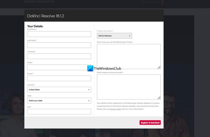 Ambos lo llevarán a la página Sus detalles. Complete los datos necesarios y luego haga clic enRegístrate y descarga. Si ha optado por DaVinci Resolve, encontrará elDescargar sóloy se puede descargar sin completar ningún detalle.