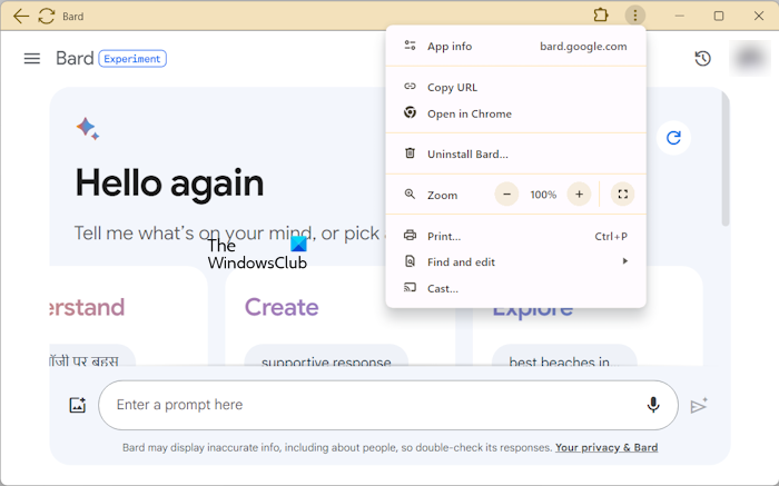 Ahora, haga doble clic en el acceso directo del escritorio de Gemini Bard AI para iniciarlo. Verás elRefrescarbotón en la parte superior izquierda. Haga clic en las tres líneas horizontales en la parte superior derecha para acceder a más opciones.