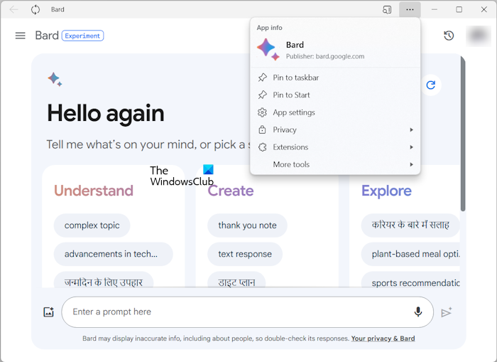 Puede utilizar Google Gemini Bard en Windows 11/10 de dos formas: instalándolo en su sistema o accediendo a él desde su navegador web. Ambos métodos requieren que inicies sesión con tu cuenta de Google.