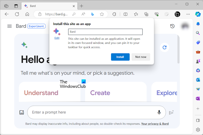También puede instalar Gemini AI en Windows 11/10 a través del navegador Microsoft Edge. Para hacerlo, siga los pasos que se indican a continuación: