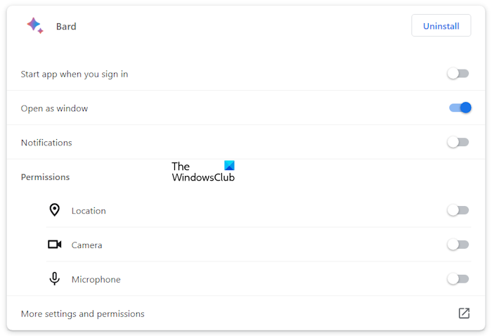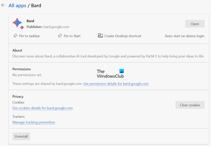 Si instala la aplicación Gemini Bard AI desde Chrome, puede desinstalarla directamente desde la aplicación Gemini AI sin abrir el navegador Chrome. Pero este no es el caso si instalas la aplicación Gemini AI desde Microsoft Edge. Aquí, debe abrir su página de configuración en el navegador Edge para desinstalarlo.