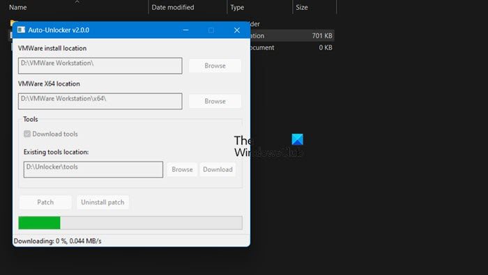 VMware Workstation Pro no admite la instalación de macOS de forma predeterminada. Necesitas instalarDesbloqueador automáticopara habilitarlo. Para eso, ve agithub.com, desplácese hacia abajo y descargue elDesbloqueador-v2.0.1-x64.ziparchivo. Una vez descargado, extraiga el archivo ZIP y vaya a la carpeta extraída. Ejecute el archivo ejecutable como administrador y una vez abierto, haga clic en Parche. Déjelo ejecutar, una vez que se complete el parche, recibirá un mensaje que indica"El parche se ha instalado correctamente".