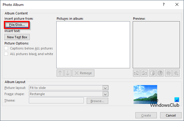 bajo elInsertar imagen desdesección, haga clic enArchivo/Discobotón.