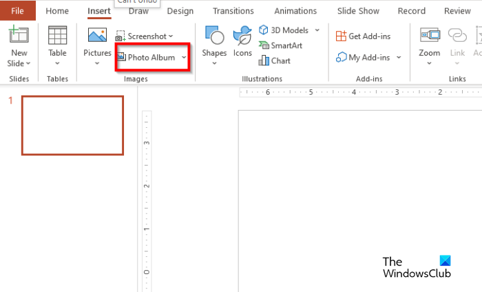- Haga clic en elInsertarpestaña, luego haga clicÁlbum de fotosPowerPoint.