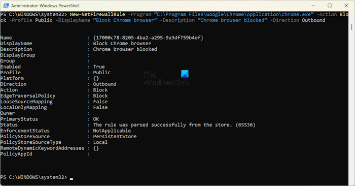 New-NetFirewallRule -Program “C:\Program Files\Google\Chrome\Application\chrome.exe” -Action Block -Profile Domain, Private, Public -DisplayName “Block Chrome browser” -Description “Chrome browser blocked” -Direction Outbound