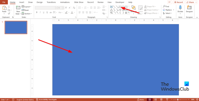 - En la pestaña Inicio, elija una forma de rectángulo de la galería de formas y luego dibújela sobre la diapositiva.