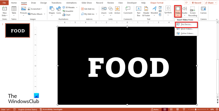 - Haga clic en la pestaña Insertar, haga clic en el botón Video y luego seleccione Este dispositivo