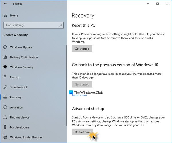 Lo primero es lo primero, deberá reiniciar su PC en las opciones de Inicio avanzado. Es bastante fácil hacerlo. Cierre todos los programas que esté ejecutando en su PC y abra la configuración de Windows. Haga clic en Actualización y seguridad > Recuperación y encontrará un botón Reiniciar ahora en Inicio avanzado.