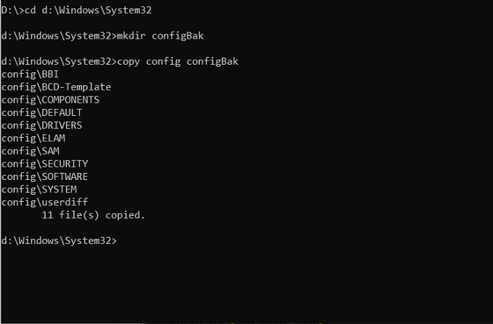 Ahora, debe crear una carpeta como copia de seguridad temporal de los archivos en su carpeta de configuración. Hacemos esto porque también hay una copia de los archivos del Registro en la carpeta de configuración. Para hacerlo, escriba la siguiente línea de comando y presione Entrar.