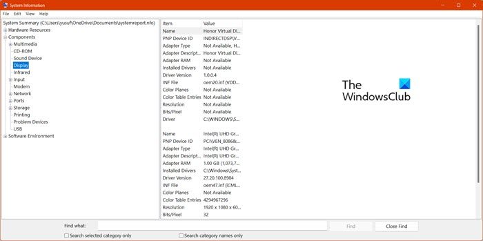 bajo elResumen del sistema,encontrarás elComponentessección. Tendrá todos los dispositivos conectados a su computadora. Por ejemplo, habrá una sección para monitor llamadaMultimedia >Mostrar,que tiene información relacionada con el monitor conectado a su computadora.