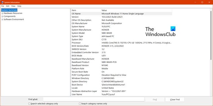 En el lado derecho del informe, veráResumen del sistema,debajo del cual encontrará las secciones a las que necesita acceder. Ahora mismo, analicemos el Resumen del sistema. Como estás en elResumen del sistemaEn la pantalla, encontrará todas las especificaciones de su sistema, incluido el sistema operativo que está ejecutando, el tipo de sistema y más.