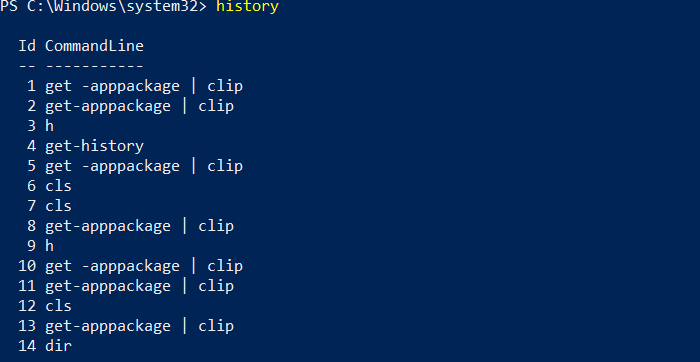 Escriba Historial y presione la tecla Intro. Debería poder ver todos los comandos que ejecutó en la sesión actual. Si bien puede ver los comandos ejecutados en la sesión anterior usando las teclas de flecha, el Historial no los tendrá. Si presionas eltecla “H”y presiona enter, revelará el Historial de comandos. Considérelo como un atajo al comando Historial.