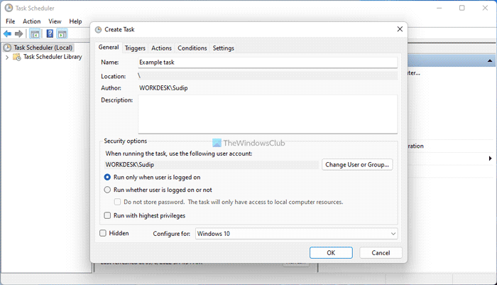 Ingrese un nombre y una descripción para su tarea y elijaventanas 10desdeConfigurar paramenú.