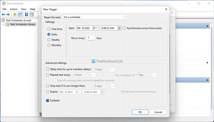 Aunque Windows 11/1 no tiene una opción incorporada para configurar un recordatorio, puedes usar Cortana para hacer las cosas. Sin embargo, Cortana usa Microsoft To Do para completar la tarea. Si no desea pasar por todas esas cosas, puede seguir la guía antes mencionada para configurar un recordatorio. Ya sea que desee recibir el recordatorio diariamente, semanalmente o una vez, puede seguir los pasos mencionados anteriormente.