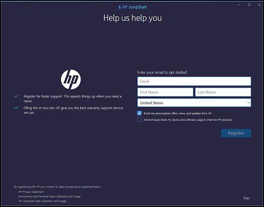 Luego viene la pantalla de registro. El registro no es obligatorio, pero se recomienda registrarse en HP para obtener un mejor soporte y un servicio más rápido. Hay un formulario sencillo, complétalo y Regístrate. Tenga en cuenta que la aplicación HP Jump Start no funcionará si su conexión es débil o su servidor no funciona. En ambos casos, la aplicación se cerrará automáticamente.