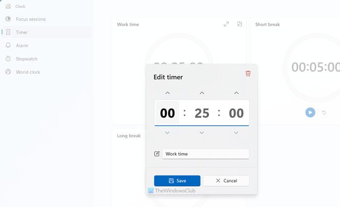 Hay otra forma de utilizar la técnica Pomodoro incorporada en Windows 11/10. Necesitas usar elpara hacer el trabajo. En ese caso, deberá configurar un temporizador de un mínimo de 26 minutos. Para eso, cambie alSesiones de enfoquepestaña en la aplicación Reloj y configure un temporizador. Podría ser cualquier cosa, pero no debería ser menos de 26 minutos.