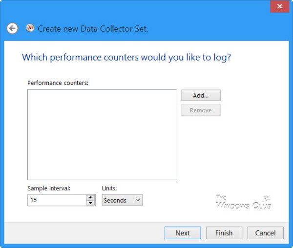 Hacer clic enAgregue y seleccione los contadores de rendimiento que desea registrar. Por lo general, podrían ser memoria, uso del procesador, etc.
