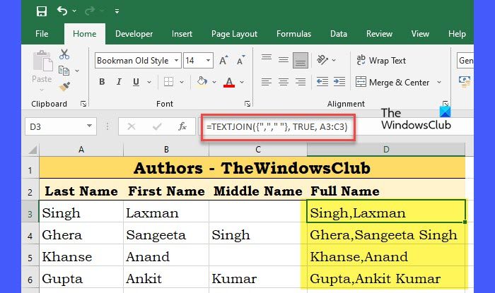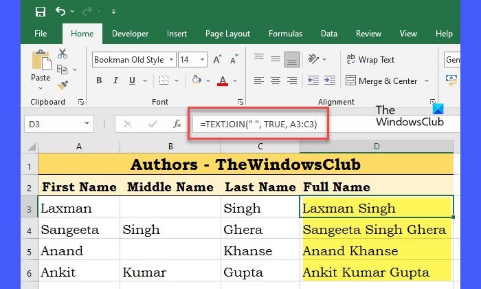=TEXTJOIN(" ", TRUE, A3:C3)Para la primera fila (Fila 3), la función devolverá 'Laxman+” “+(empty_value)+” “+Singh'