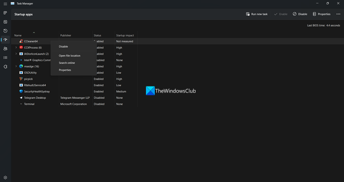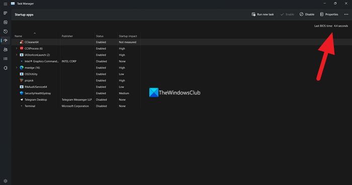 Si tiene curiosidad por saber cuánto le tomó al BIOS habilitar todo el hardware de su PC y iniciar los procesos, puede ver la hora exacta en la aplicación Administrador de tareas. Puede encontrar la hora del último BIOS en la pestaña Aplicaciones de inicio del nuevo Administrador de tareas.