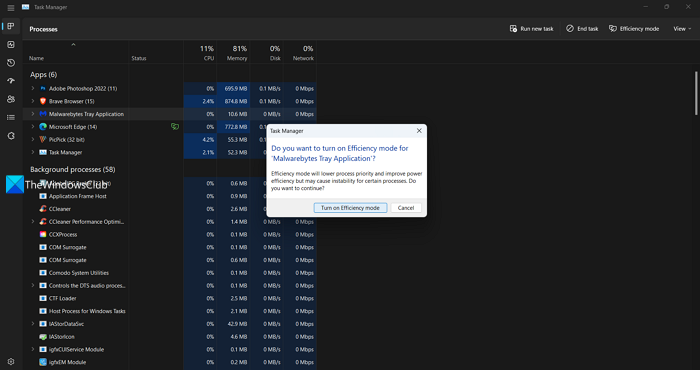 Para habilitar el modo de eficiencia, seleccione el programa en el que desea habilitar el modo de eficiencia para que utilice menos recursos y envíelo a segundo plano. Si el programa o proceso admite el modo de eficiencia, verá el botón Modo de eficiencia. Si no. estará atenuado. Haga clic en elModo de eficienciapara poner el programa compatible en el modo de eficiencia. Verá un cuadro de diálogo para confirmar. Confírmalo haciendo clic en elActivar el modo de eficienciabotón. Si el modo Eficiencia está habilitado para un programa o proceso, verá un ícono de hojas verdes al lado en la lista del Administrador de tareas.