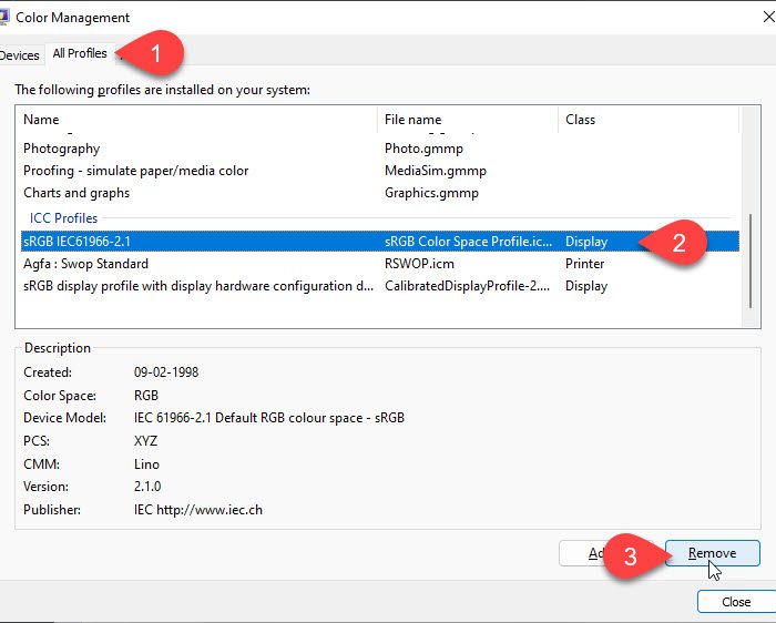 - En la ventana Gestión de color, cambie a la opciónTodos los perfilespestaña.