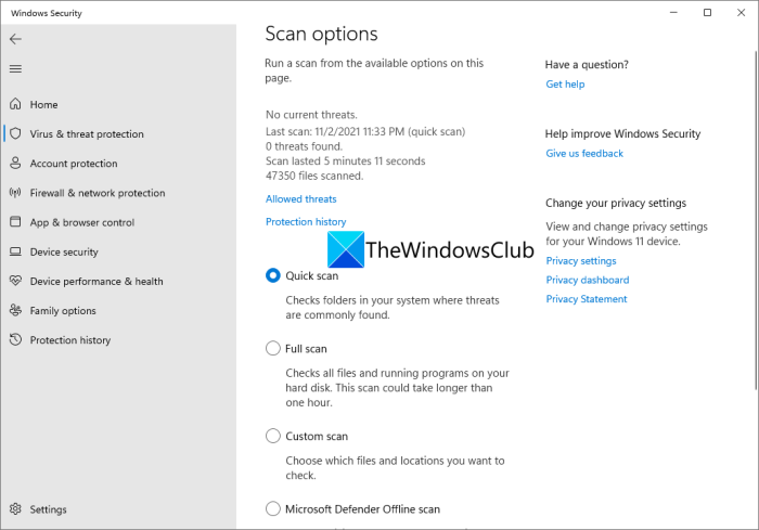 - Análisis sin conexión de Microsoft Defender:Puedey elimine el malware difícil de eliminar de su sistema utilizando definiciones de amenazas actualizadas.