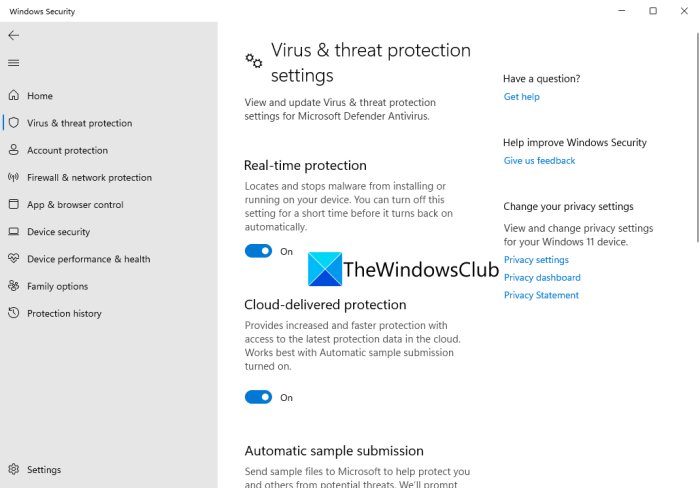 Para aprovechar al máximo la seguridad de Windows, puede configurar los ajustes de protección contra virus y amenazas en consecuencia. Para eso, abra Seguridad de Windows y vaya a laProtección contra virus y amenazaspestaña. Ahora, haga clic en elAdministrar configuracionesbotón presente en la configuración de protección contra virus y amenazas. Desde aquí, puede habilitar/deshabilitar las siguientes configuraciones según sus requisitos: