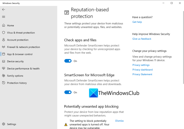Ofrece unfunción mediante la cual puede controlar la función SmartScreen de Windows Defender que protege su PC contra aplicaciones, archivos, sitios web y descargas maliciosos y potencialmente no deseados. Puedes hacer clic en elConfiguración de protección basada en reputaciónopción para configurar funciones como verificar aplicaciones y archivos,para Microsoft borde,, y.