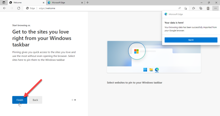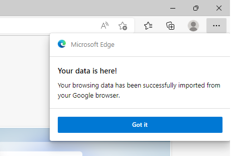 Una notificación en la esquina superior derecha de la ventana del navegador confirmará que Microsoft Edge ha importado correctamente los datos del navegador desde Google Chrome.