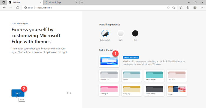 La siguiente pantalla le pedirá que elija un tema para su navegador. Seleccione un tema y haga clic en el botón 'Siguiente'.