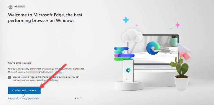 Inicie el navegador Microsoft Edge en su PC. En la pantalla de bienvenida, haga clic en 'Confirmar y continuar'.