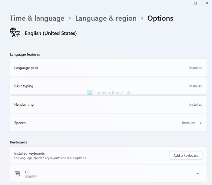 Haga clic en la opción de menú de tres puntos en cualquiera de los idiomas disponibles y seleccione Opciones de idioma. Luego podrá observar dónde se puede usar el idioma, es decir, paquete de idiomas, mecanografía, escritura a mano y voz. También puede agregar un teclado específico del idioma.