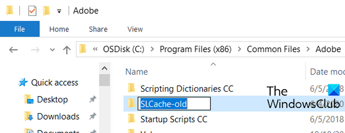 Otra cosa que puedes hacer para solucionar el problema es cambiar el nombre de las carpetas SLCache y SLStore en el directorio de instalación de Adobe. Los archivos corruptos dentro de estas carpetas pueden estar causando el problema. Por lo tanto, cambiar el nombre restablecerá estas carpetas y es probable que solucione el problema. Estos son los pasos que puede seguir para hacerlo:
