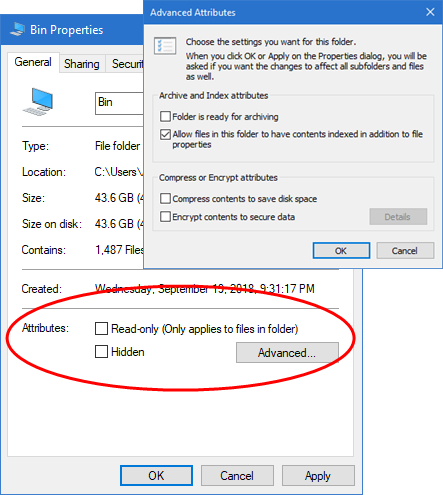 Una casilla de verificación en blanco indica que ninguno de los elementos tiene ese atributo, mientras que una marca de verificación indica que ese archivo o todos los archivos de la carpeta tienen ese atributo.