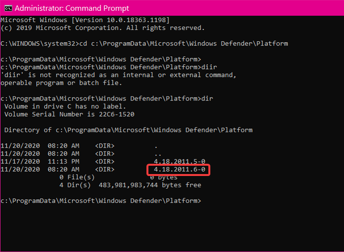El comando anterior te lleva a laPlataformacarpeta de Windows Defender. El siguiente paso es determinar su última versión de Microsoft Defender.