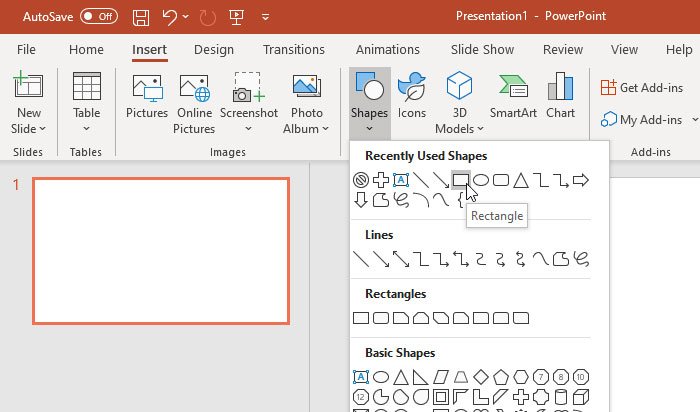 Al principio, debes abrir una diapositiva donde deseas mostrar la forma combinada en tu presentación. Después de eso, debes insertar dos formas que quieras fusionar. Para eso, cambie alInsertarpestaña, expanda laformasy seleccione dos o más formas que desee combinar.