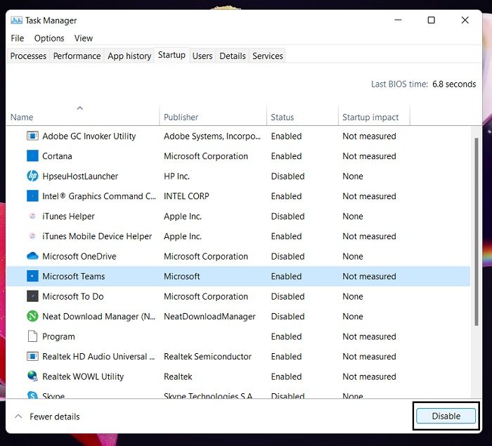 - Aquí verá una lista de aplicaciones y procesos designados para activarse en el inicio. Localice Microsoft Teams, selecciónelo y haga clic en el botón Desactivar en la parte inferior derecha