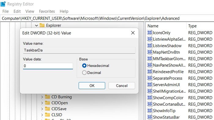 - En la lista de entradas DWORD aquí, busque 'Barra de tareasDa'. Haga clic en él y seleccione para modificarlo.