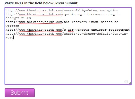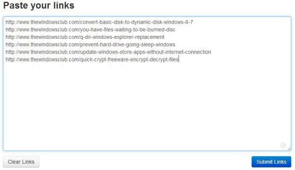 Esta herramienta web funciona igual que RapidLinkr. Pegue todas las URL que desee abrir y haga clic en "Enviar enlaces" y luego en "Abrir todo". La herramienta abrirá todas las URL a la vez en diferentes ventanas.