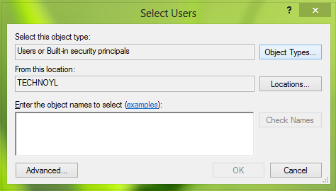 Luego enSeleccionar usuariosventana, haga clic enTipos de objetos.