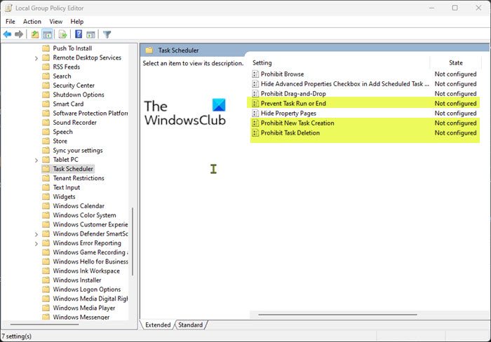 Para evitar que otros usuarios creen, eliminen o ejecuten tareas en el Programador de tareas en una computadora con Windows 11/10 usando el Editor de políticas de grupo local, siga estos pasos: