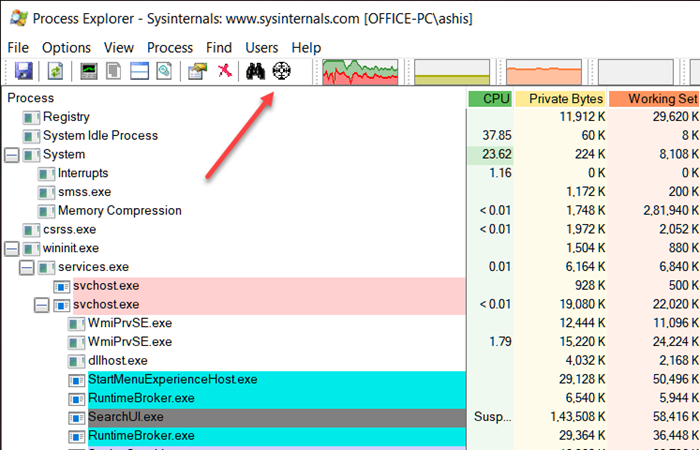 Inicie el programa Process Explorer y busque el ícono que dice "Buscar proceso de Windows". Arrastre el ícono y suéltelo en el archivo, y revelará instantáneamente el proceso.