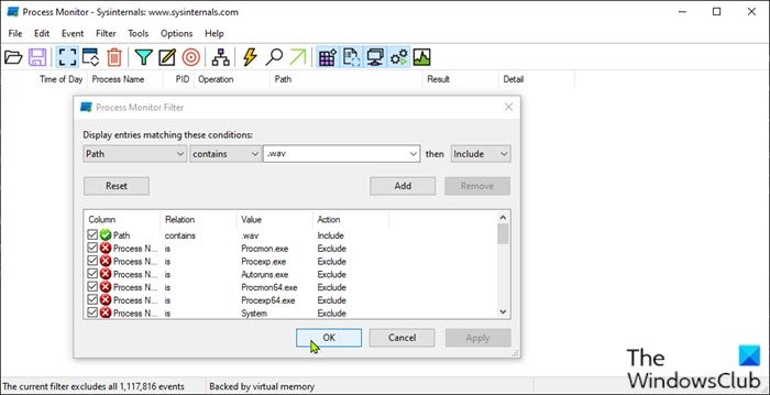 Ahora, mantenga la herramienta Procmon ejecutándose en segundo plano. No lo cierres. Espere un momento hasta que escuche el sonido. Entonces, mira debajoNombre del procesoyCaminocolumnas para descubrir la aplicación que envía el sonido de notificación. Podrías filtrar por procesos .wav.