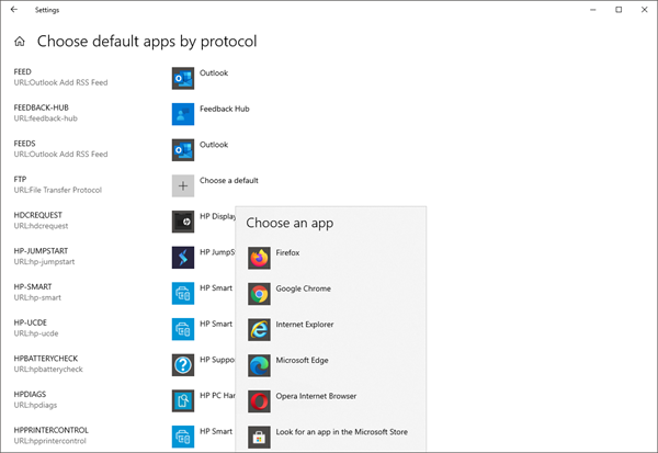 De manera similar, también puede establecer los valores predeterminados por extensiones de tipo de archivo. Haga clic en el azulElija aplicaciones predeterminadas por protocolo. Seleccione el protocolo y luego configure la aplicación predeterminada.