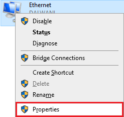 Haga clic derecho en la red a la que está conectado actualmente y luego haga clic en Propiedades. Si la conexión es por cable, elija Ethernet o si la conexión es inalámbrica, elija la conexión inalámbrica.
