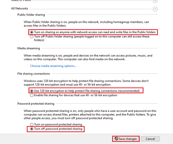 Ahora, en la sección Todas las redes, en Conexiones para compartir archivos, seleccione Cifrado de 128 bits.