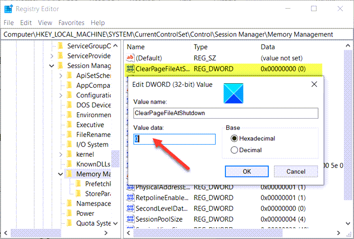 Entonces, en elEditar valor DWORDpantalla que aparece, cambie el valor deClearPageFileAtShutDownde 0 a 1 y haga clic en Aceptar.