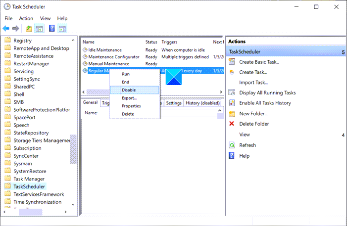 Ampliar elMemoriaDiagnósticocarpeta >Programador de tareasy seleccioneEjecutar diagnóstico de memoria completadesde el panel derecho. Haga clic derecho y elijaDesactivaropción para detener el proceso.