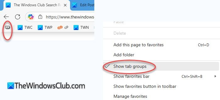 Para eliminar el botón Grupos de pestañas en la barra de Favoritos o Marcadores de Edge, haga clic derecho en la barra de Favoritos y desmarque la casillaMostrar grupos de pestañasopción en el menú. El botón Grupos de pestañas estará oculto.